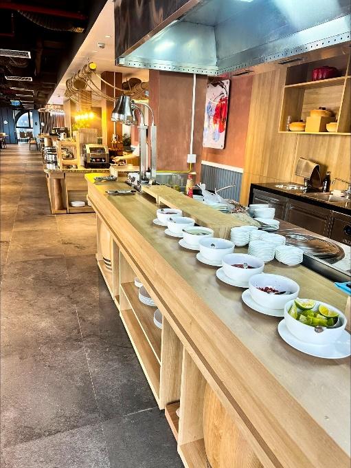 Khu bếp mở được thiết kế theo phong cách hiện đại, tạo nên một không gian ẩm thực sạch sẽ, ấm cúng và đầy cảm hứng. Tại đây, du khách có thể quan sát trực tiếp quá trình chế biến món ăn, cảm nhận mùi hương hấp dẫn lan tỏa và sự khéo léo của các đầu bếp trong từng thao tác.