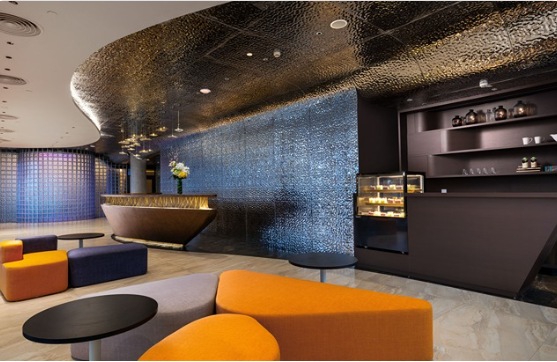 Không gian thư giãn với ánh sáng tự nhiên, phục vụ cà phê, trà và đồ uống nhẹ. Thiết bị bar – café được bố trí tinh gọn và hiện đại.